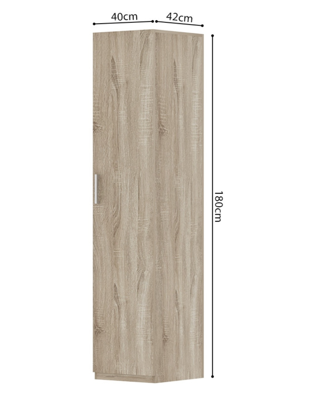 Le meuble de rangement est fabriqué en panneaux de particules avec une finition en papier décor, offrant un aspect bois uniforme et une protection contre les petites rayures et l’usure. L’armoire est équipée d’une porte battante avec des poignées en plastique finition grise. À l’intérieur se trouvent plusieurs étagères fixes, idéales pour ranger divers objets de manière ordonnée. Grâce à son design étroit et haut, l’armoire occupe peu d’espace au sol tout en offrant une capacité de rangement suffisante.