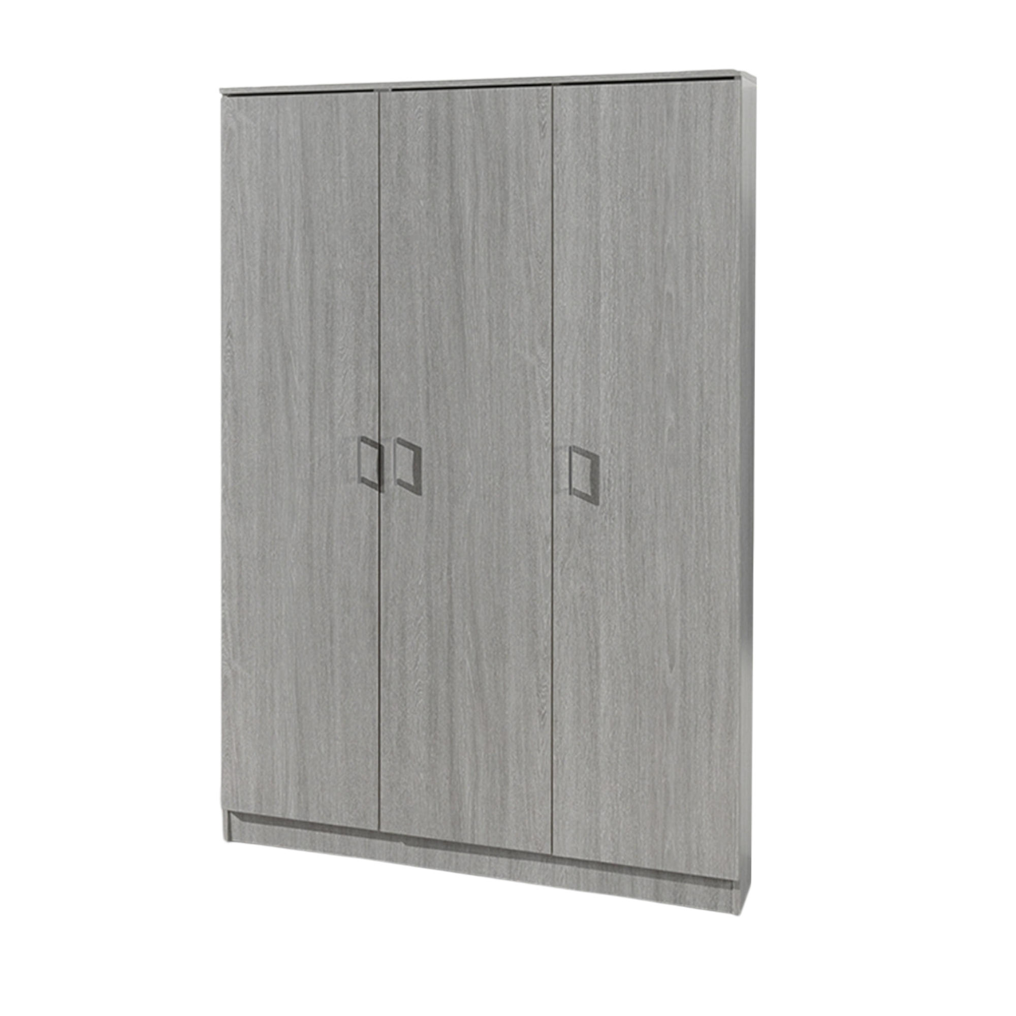 L’armoire est fabriquée en panneau de particules, composé de fibres de bois pressées avec de la résine sous haute pression pour former des panneaux solides. Ce matériau est stable et conserve bien sa forme. Les surfaces visibles sont recouvertes d’une couche décorative. Il s’agit d’un papier imprimé, imprégné de résine et collé sous haute pression sur le panneau de particules. Cette finition décorative donne à l’armoire une apparence bois et protège la surface contre l’usure et les petites détériorations. L’intérieur est composé de plusieurs étagères fixes, réparties uniformément sur toute la hauteur de l’armoire. Cette disposition offre un espace de rangement pratique pour les vêtements ou d’autres objets du quotidien.