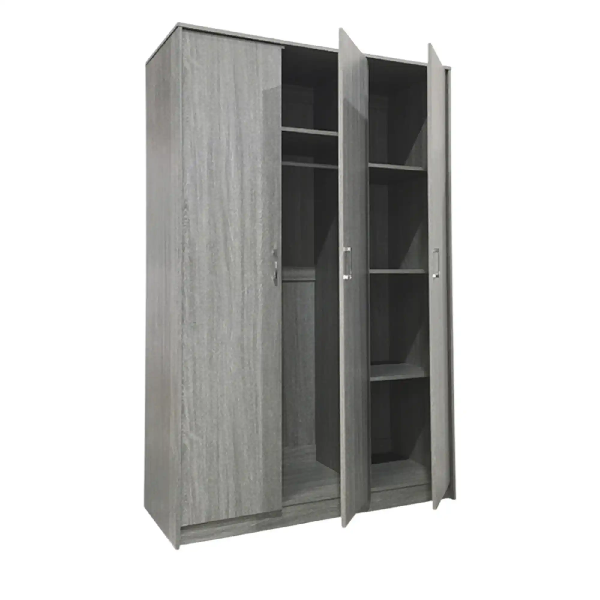L’armoire est fabriquée en panneau de particules, composé de fibres de bois pressées avec de la résine sous haute pression pour former des panneaux solides. Ce matériau est stable et conserve bien sa forme. Les surfaces visibles sont recouvertes d’une couche décorative. Il s’agit d’un papier imprimé, imprégné de résine et collé sous haute pression sur le panneau de particules. Cette finition décorative donne à l’armoire un aspect bois et protège la surface contre l’usure et les petites détériorations. L’armoire est divisée en trois compartiments. La partie centrale contient une large tringle à vêtements avec une étagère au-dessus, adaptée aux vêtements suspendus et offrant un espace de rangement supplémentaire. Les parties gauche et droite sont équipées de plusieurs étagères fixes, réparties sur la hauteur, offrant ainsi de la place pour les vêtements pliés et les petits objets.