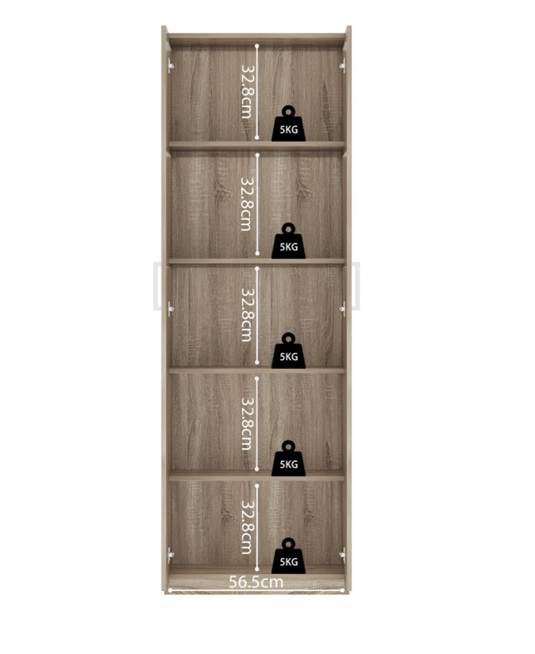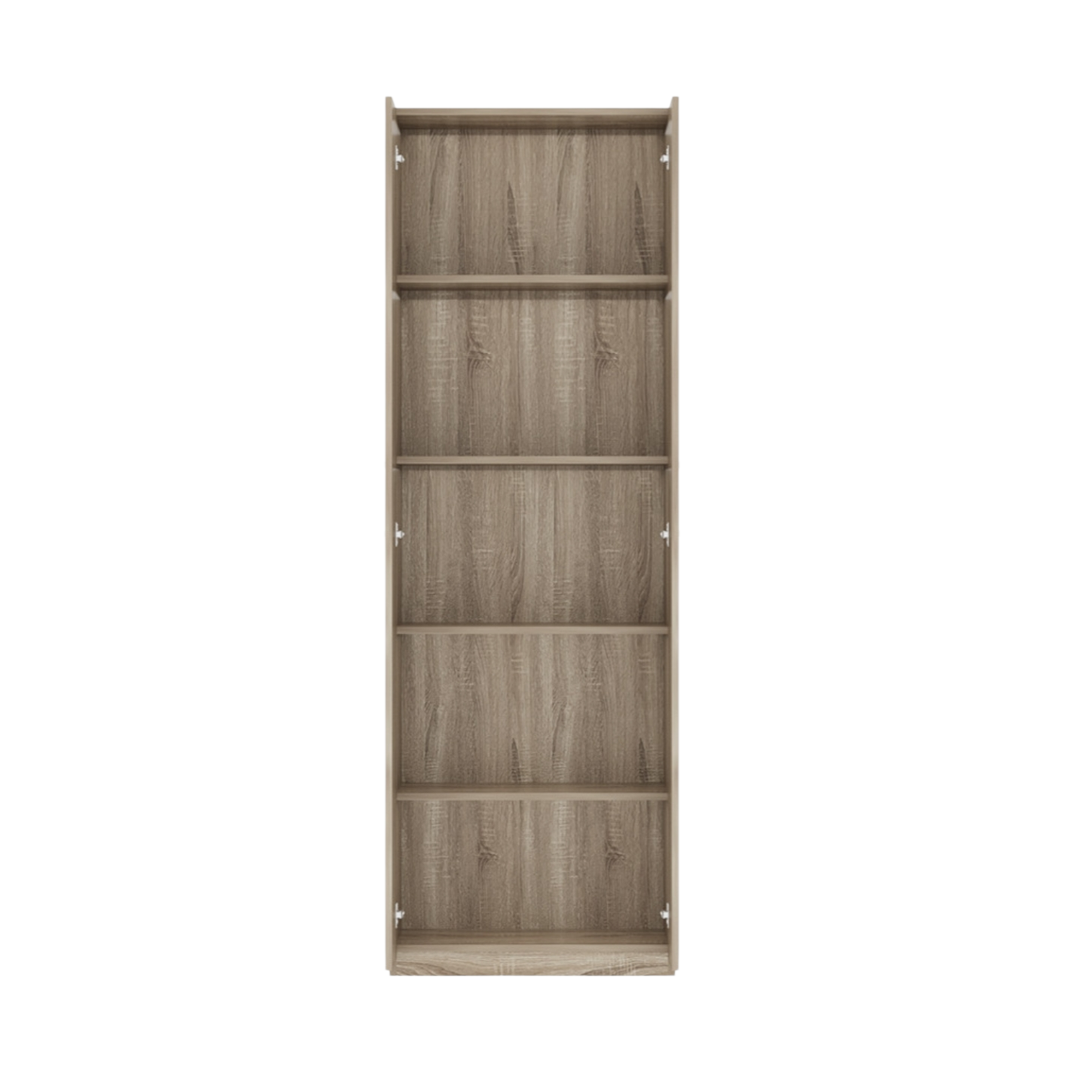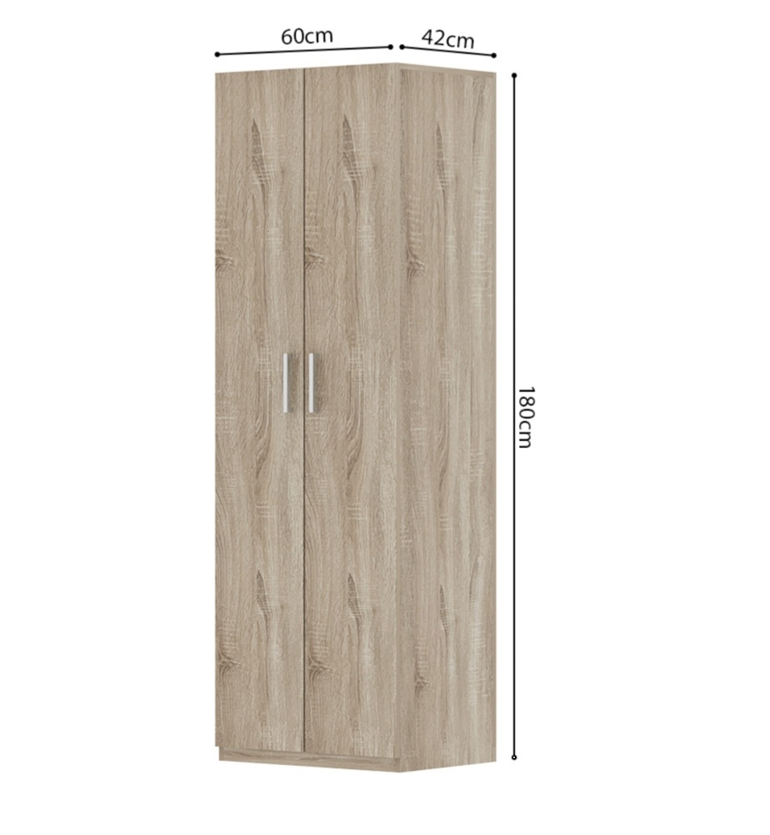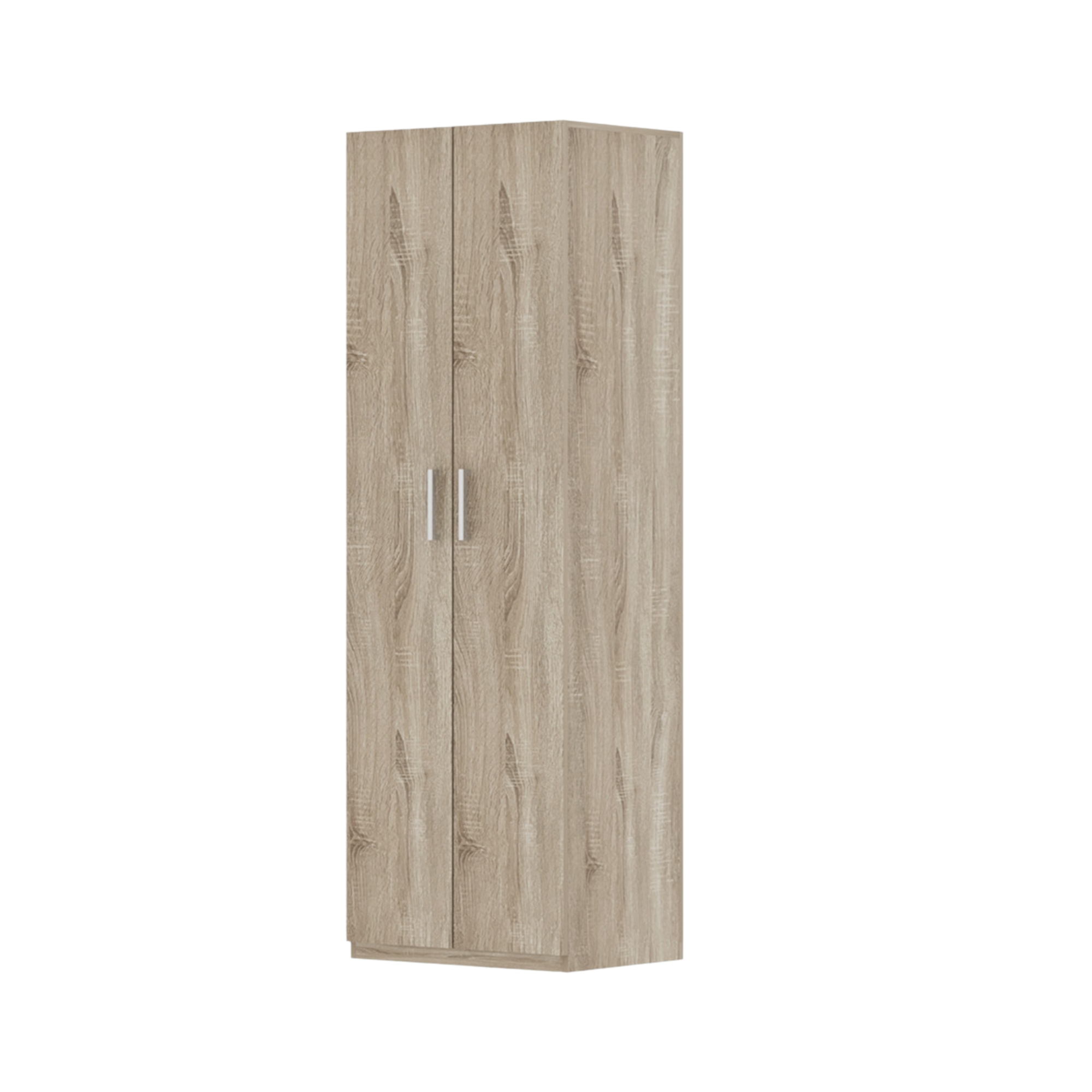 Le meuble de rangement est fabriqué en panneaux de particules avec une finition en papier décor, offrant un aspect bois et une protection contre les petites rayures et l’usure. Il est équipé d’une porte battante avec une poignée en plastique finition grise. À l’intérieur, plusieurs étagères fixes permettent de ranger divers objets de manière ordonnée. Grâce à son design étroit et haut, ce meuble est à la fois peu encombrant et fonctionnel.