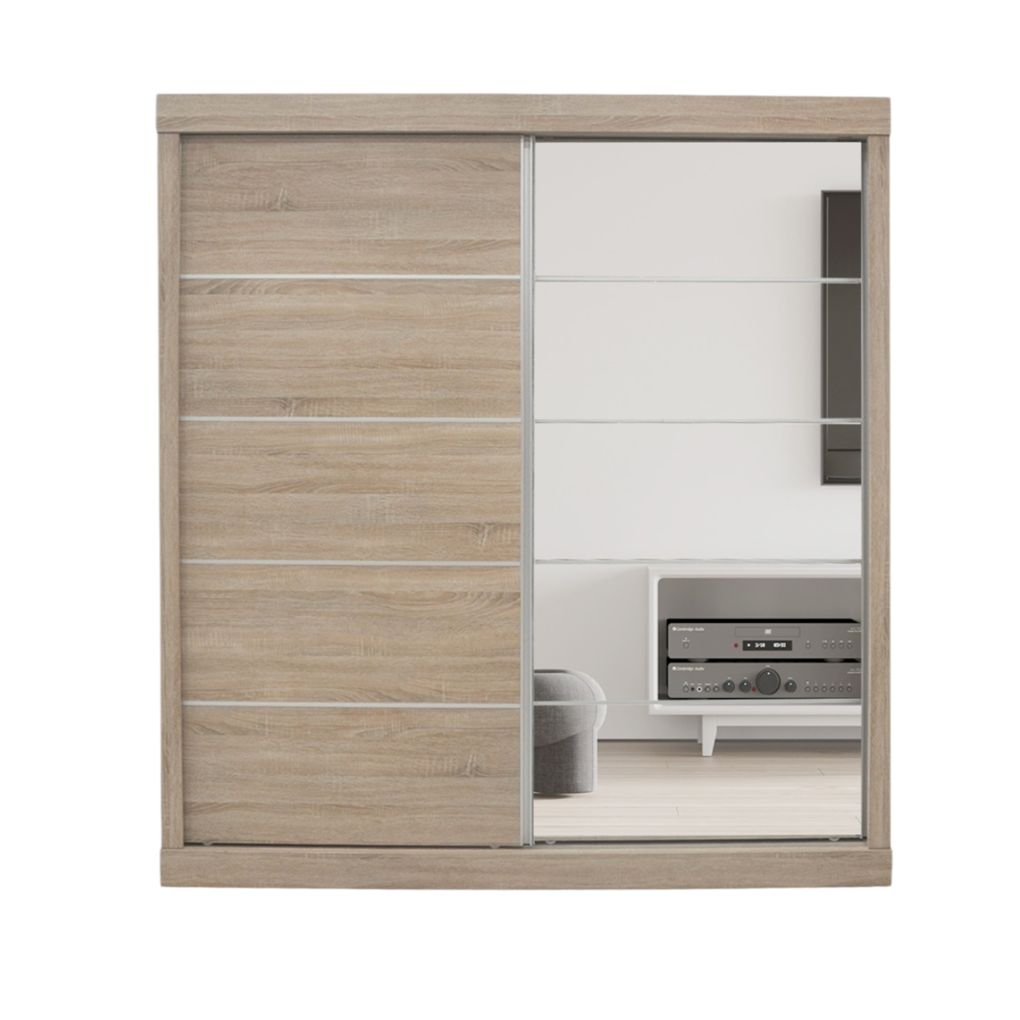 L’armoire est composée d’une combinaison de panneau de particules et de MDF. Le panneau de particules constitue la structure de base et assure solidité et capacité de charge, tandis que le MDF est utilisé pour les façades afin d’obtenir une surface lisse et stable. Les deux matériaux sont recouverts d’une couche décorative de papier imprimé, imprégné de résine et collé sous haute pression. Cette couche confère à l’armoire un aspect uniforme et protège contre les petites rayures et l’usure. L’armoire est équipée de quatre portes battantes, dont les deux portes centrales intègrent des miroirs solidement fixés aux panneaux, ce qui augmente la praticité du meuble. L’intérieur est organisé de manière claire avec une section centrale comprenant une étagère supérieure et une tringle en dessous pour les vêtements suspendus. De chaque côté se trouvent plusieurs étagères fixes, adaptées aux vêtements pliés et aux accessoires. Enfin, deux tiroirs intégrés dans la partie centrale inférieure offrent un espace de rangement supplémentaire pour les petits vêtements ou les effets personnels.