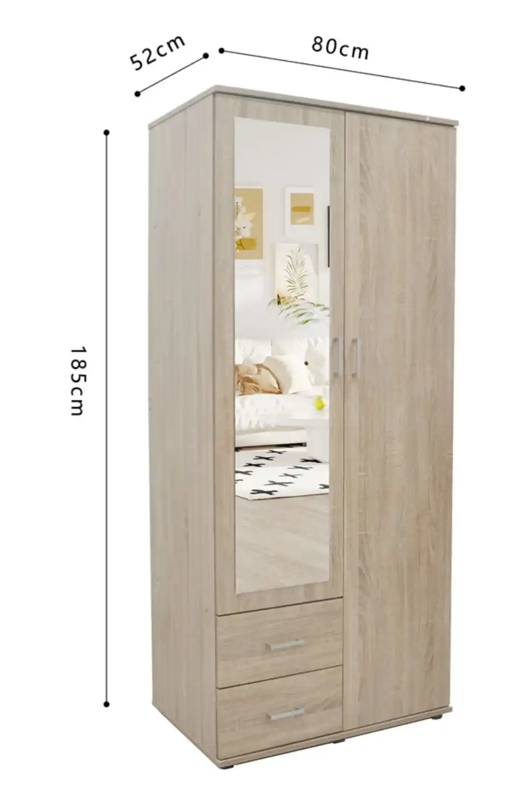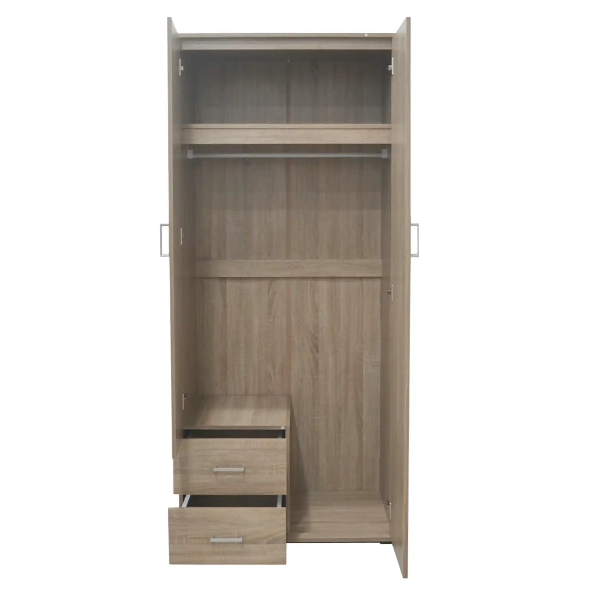 L’armoire est composée d’une combinaison de panneau de particules et de MDF. Le panneau de particules constitue la structure de base et assure solidité et capacité de charge, tandis que le MDF est utilisé pour les façades afin d’obtenir une surface lisse et stable. Les deux matériaux sont recouverts d’une couche décorative de papier imprimé, imprégné de résine et collé sous haute pression. Cette couche confère à l’armoire un aspect uniforme et protège contre les petites rayures et l’usure. L’armoire est équipée de quatre portes battantes, dont les deux portes centrales intègrent des miroirs solidement fixés aux panneaux, ce qui augmente la praticité du meuble. L’intérieur est organisé de manière claire avec une section centrale comprenant une étagère supérieure et une tringle en dessous pour les vêtements suspendus. De chaque côté se trouvent plusieurs étagères fixes, adaptées aux vêtements pliés et aux accessoires. Enfin, deux tiroirs intégrés dans la partie centrale inférieure offrent un espace de rangement supplémentaire pour les petits vêtements ou les effets personnels.