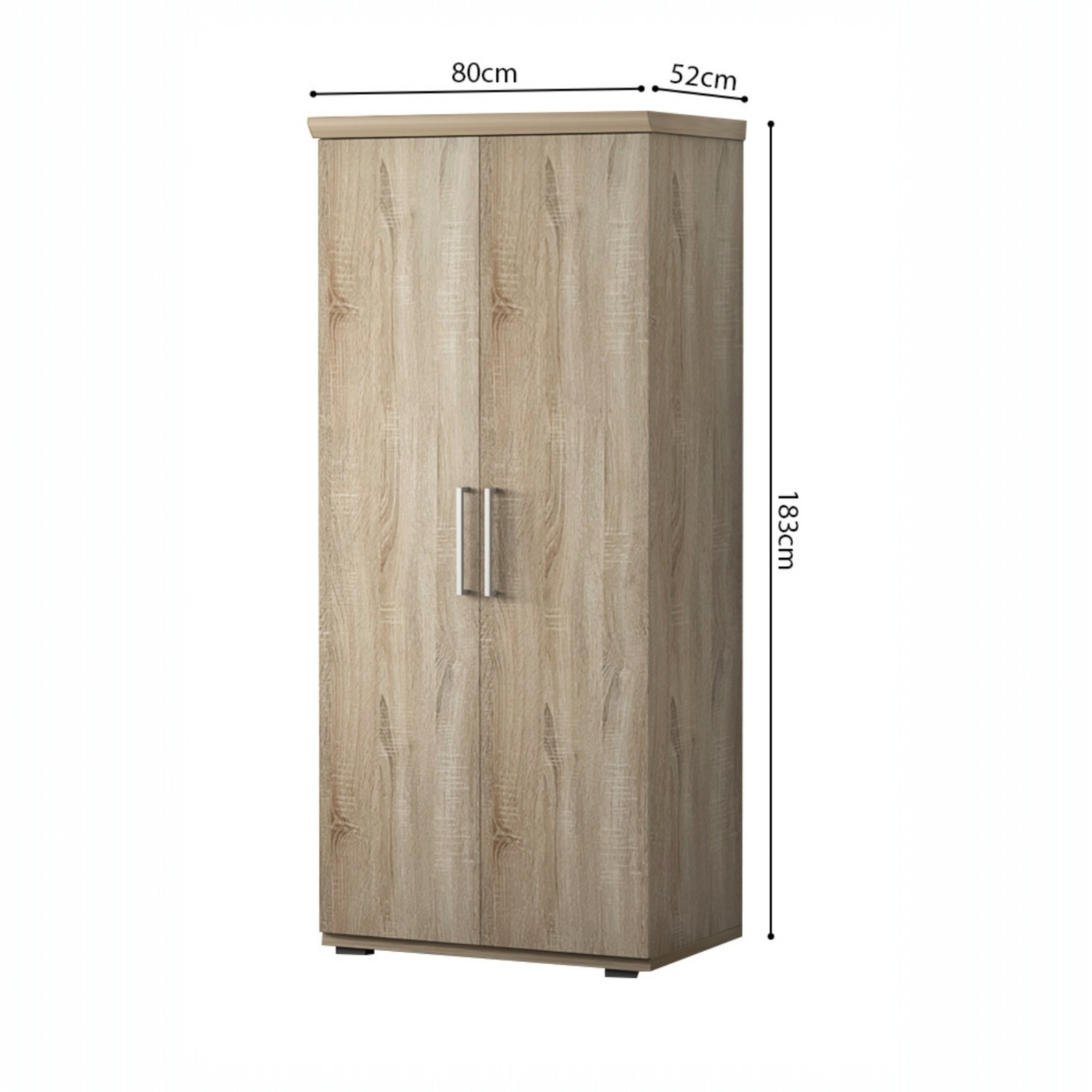 L’armoire est composée de panneaux de particules avec une finition en papier décor, offrant un aspect bois et une protection contre les petites rayures et l’usure. À l’intérieur, elle est aménagée avec une étagère supérieure et une tringle en dessous pour les vêtements suspendus. La conception offre une organisation pratique et simple, adaptée au rangement des vêtements pliés comme suspendus.