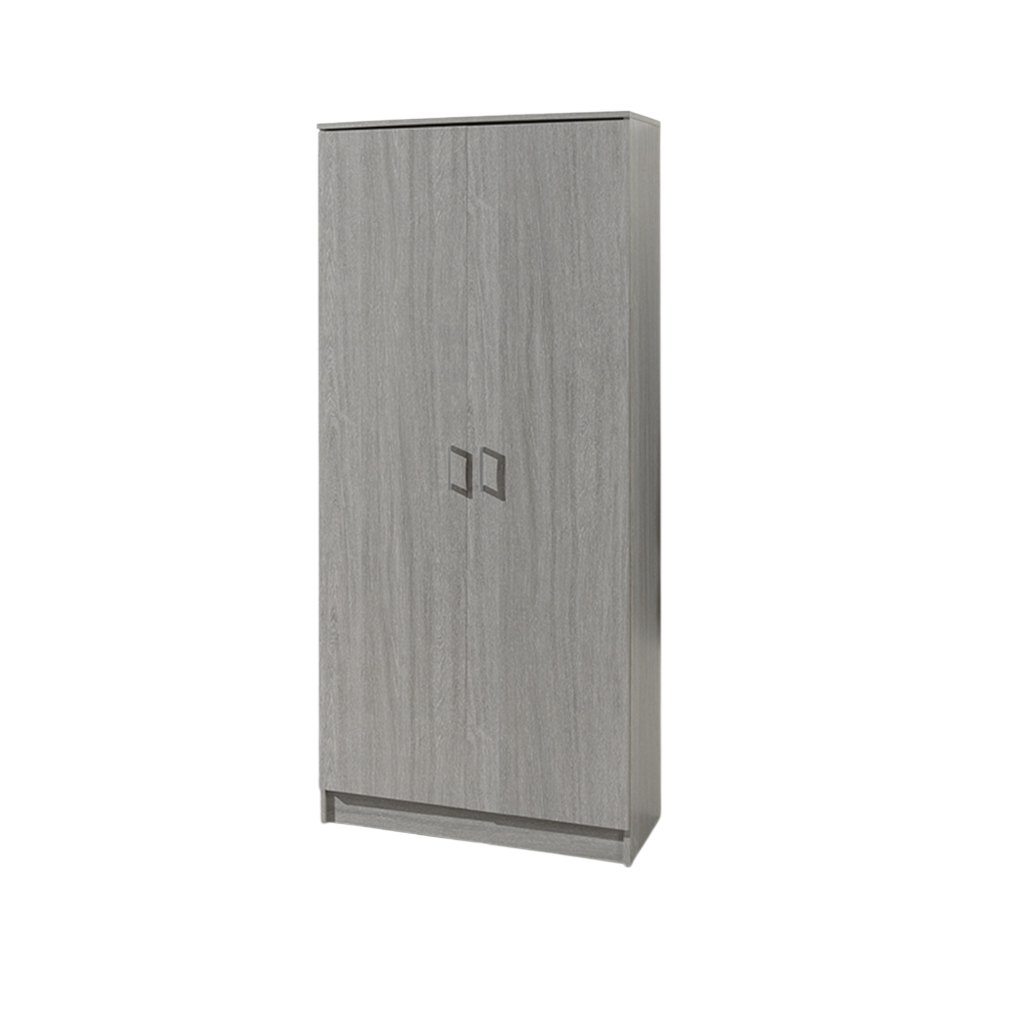 L’armoire est fabriquée en panneau de particules, composé de fibres de bois pressées avec de la résine sous haute pression pour former des panneaux solides. Ce matériau est stable et conserve bien sa forme. Les surfaces visibles sont recouvertes d’une couche décorative. Il s’agit d’un papier imprimé, imprégné de résine et collé sous haute pression sur le panneau de particules. Cette finition décorative donne à l’armoire une apparence bois et protège la surface contre l’usure et les petites détériorations. L’intérieur est composé de plusieurs étagères fixes, réparties uniformément sur toute la hauteur de l’armoire. Cette disposition offre un espace de rangement pratique pour les vêtements ou d’autres objets du quotidien.