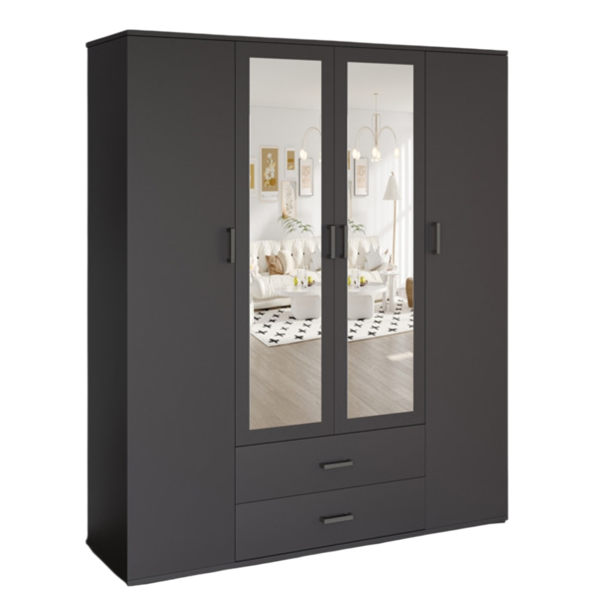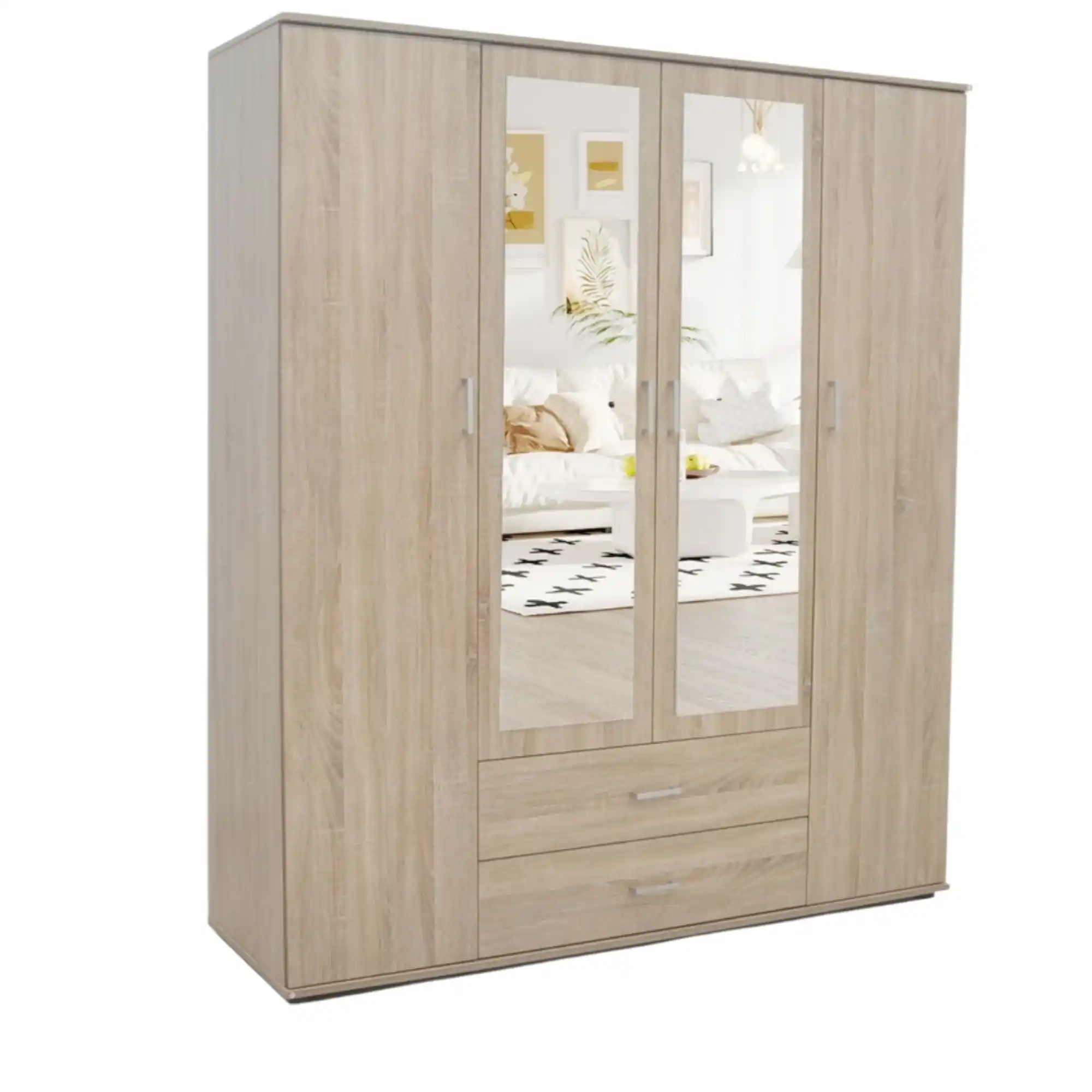 L’armoire est composée d’une combinaison de panneau de particules et de MDF. Le panneau de particules constitue la structure de base et assure solidité et capacité de charge, tandis que le MDF est utilisé pour les façades afin d’obtenir une surface lisse et stable. Les deux matériaux sont recouverts d’une couche décorative de papier imprimé, imprégné de résine et collé sous haute pression. Cette couche confère à l’armoire un aspect uniforme et protège contre les petites rayures et l’usure. L’armoire est équipée de quatre portes battantes, dont les deux portes centrales intègrent des miroirs solidement fixés aux panneaux, ce qui augmente la praticité du meuble. L’intérieur est organisé de manière claire avec une section centrale comprenant une étagère supérieure et une tringle en dessous pour les vêtements suspendus. De chaque côté se trouvent plusieurs étagères fixes, adaptées aux vêtements pliés et aux accessoires. Enfin, deux tiroirs intégrés dans la partie centrale inférieure offrent un espace de rangement supplémentaire pour les petits vêtements ou les effets personnels.