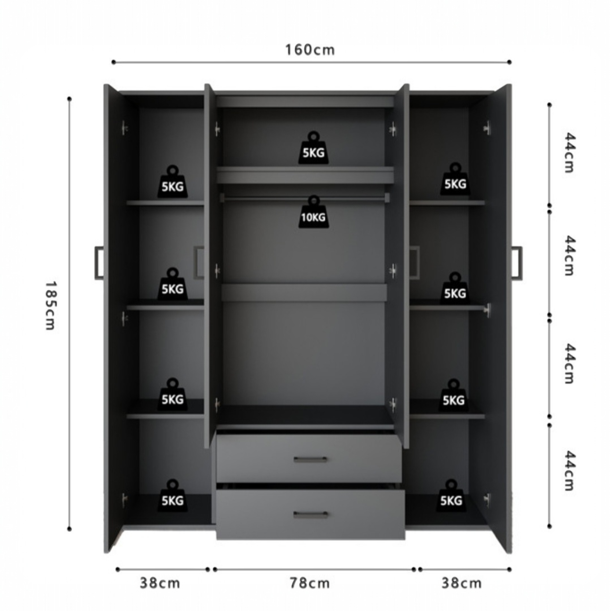 L’armoire est composée d’une combinaison de panneau de particules et de MDF. Le panneau de particules constitue la structure de base et assure solidité et capacité de charge, tandis que le MDF est utilisé pour les façades afin d’obtenir une surface lisse et stable. Les deux matériaux sont recouverts d’une couche décorative de papier imprimé, imprégné de résine et collé sous haute pression. Cette couche confère à l’armoire un aspect uniforme et protège contre les petites rayures et l’usure. L’armoire est équipée de quatre portes battantes, dont les deux portes centrales intègrent des miroirs solidement fixés aux panneaux, ce qui augmente la praticité du meuble. L’intérieur est organisé de manière claire avec une section centrale comprenant une étagère supérieure et une tringle en dessous pour les vêtements suspendus. De chaque côté se trouvent plusieurs étagères fixes, adaptées aux vêtements pliés et aux accessoires. Enfin, deux tiroirs intégrés dans la partie centrale inférieure offrent un espace de rangement supplémentaire pour les petits vêtements ou les effets personnels.