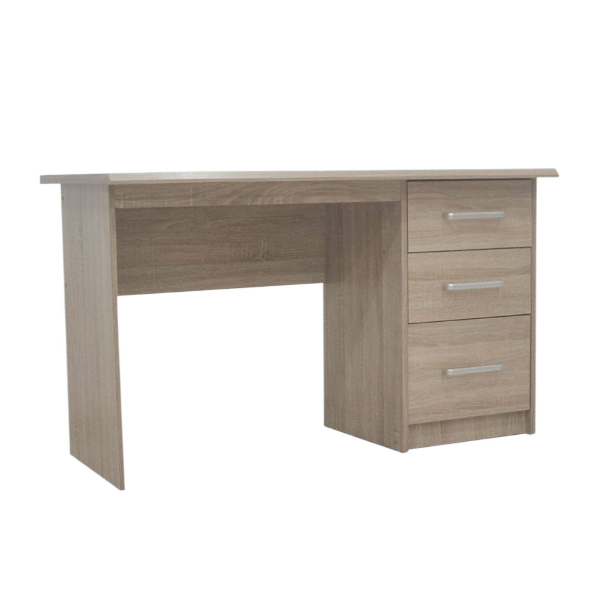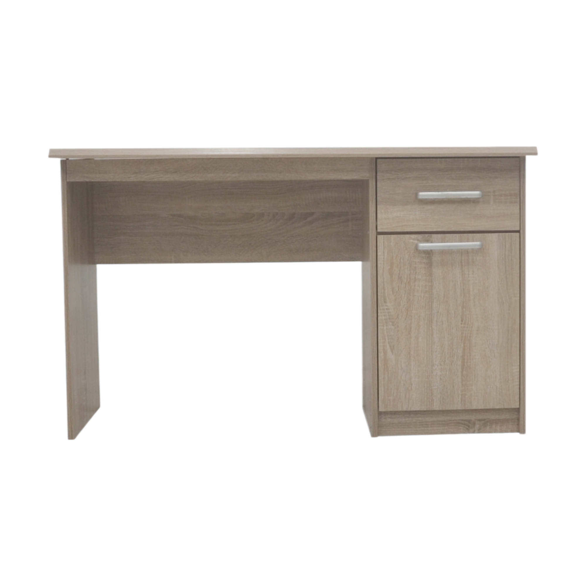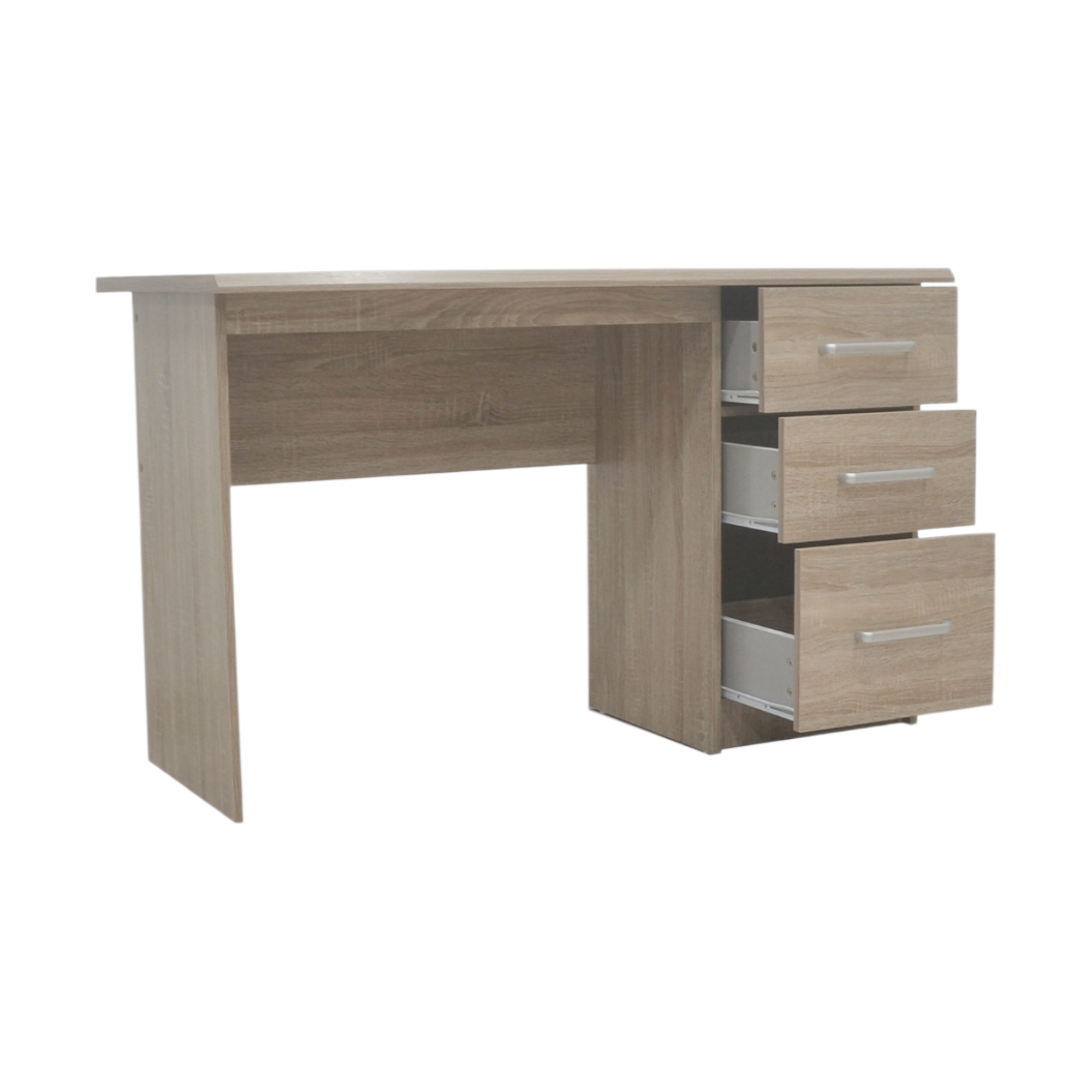 Ce bureau est fabriqué en MDF, un panneau de fibres de bois compressées avec de la résine sous haute pression. Le MDF est recouvert d’un décor papier : un papier imprimé, imprégné de résine et collé sous haute pression. Cela donne au bureau un aspect décoratif, tout en offrant une surface légère et facile à nettoyer. Toutefois, ce matériau est plus sensible aux rayures, aux chocs et surtout à l’humidité que, par exemple, le bois massif ou le mélaminé.