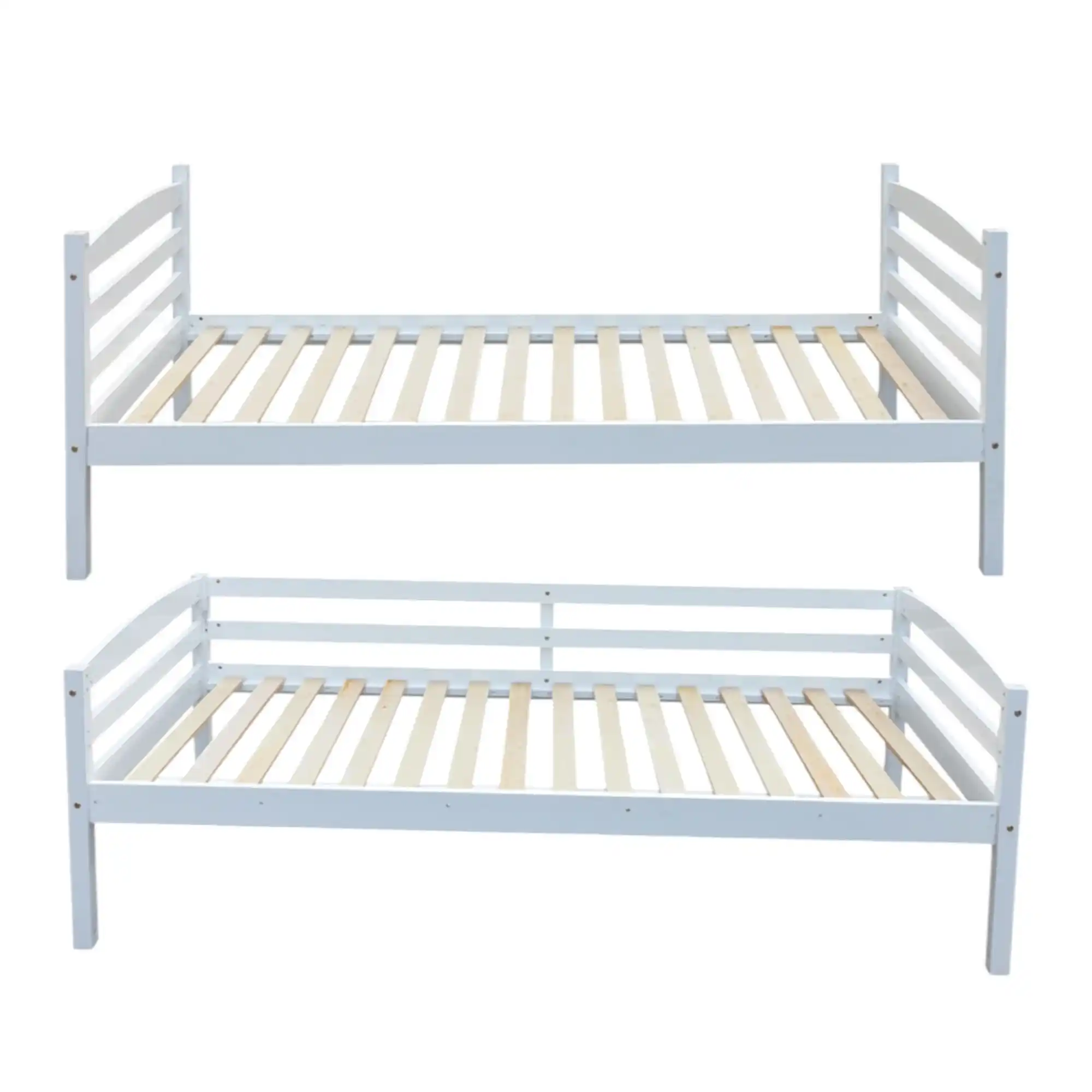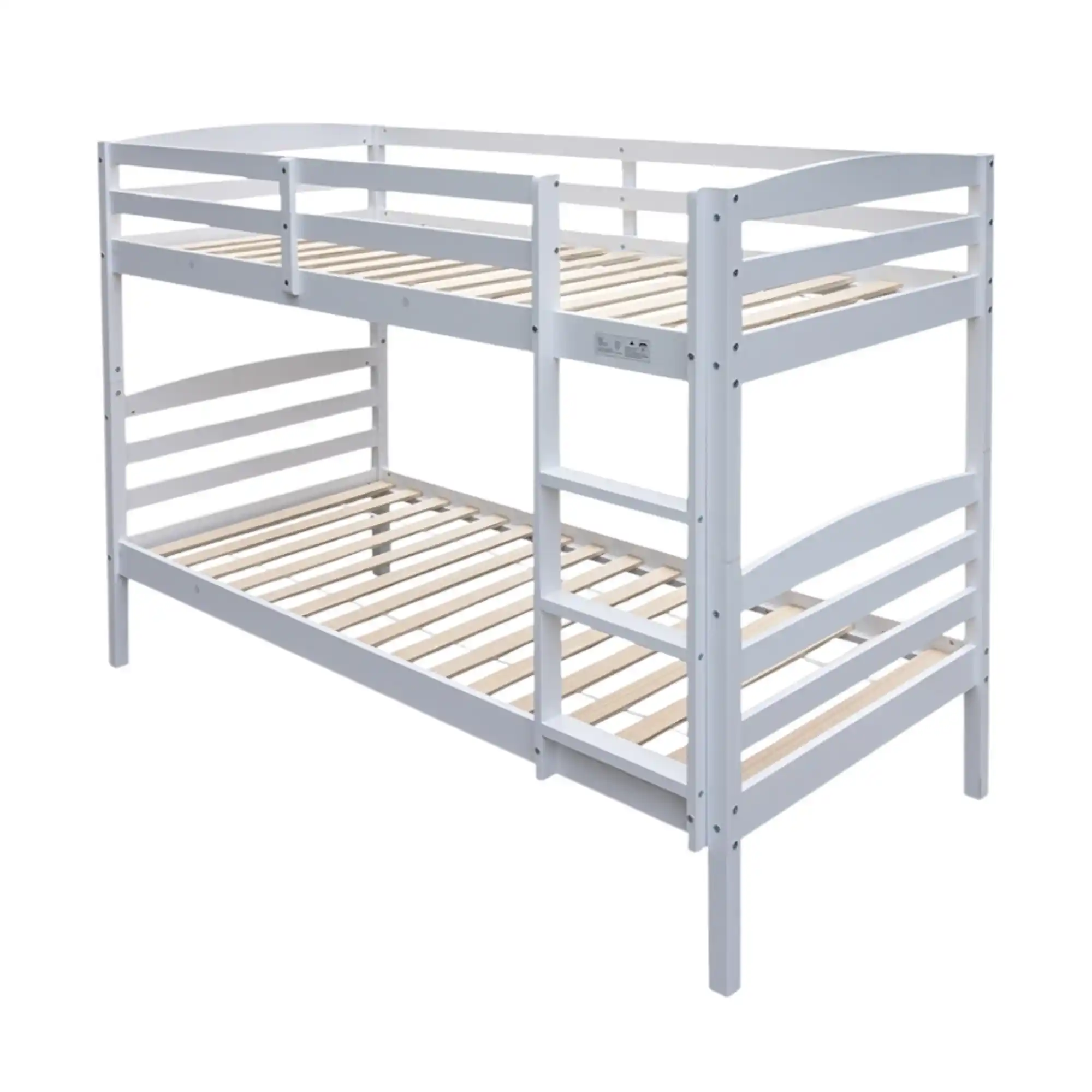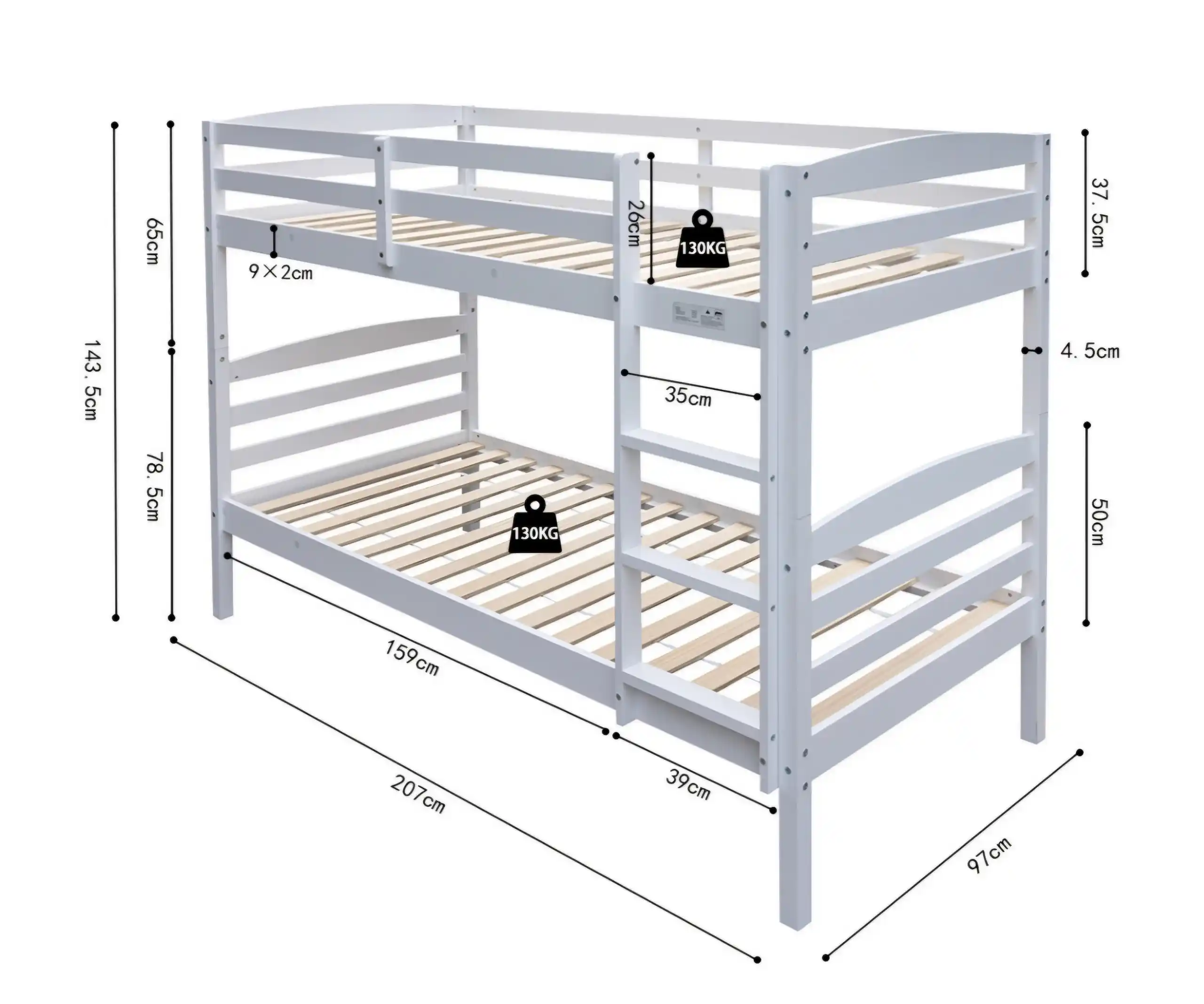 Le lit superposé est fabriqué en pin massif, un matériau solide mais relativement léger, adapté aux structures porteuses. Les différentes parties sont reliées par des boulons et des vis, ce qui assure stabilité et robustesse. Les deux surfaces de couchage sont équipées de lattes en bois qui soutiennent les matelas et garantissent une bonne ventilation. Le lit supérieur est muni de barrières de sécurité et d’une échelle fixe en bois intégrée dans le cadre. La construction peut, si souhaité, être démontée afin que le lit puisse également être utilisé comme deux lits simples séparés.
