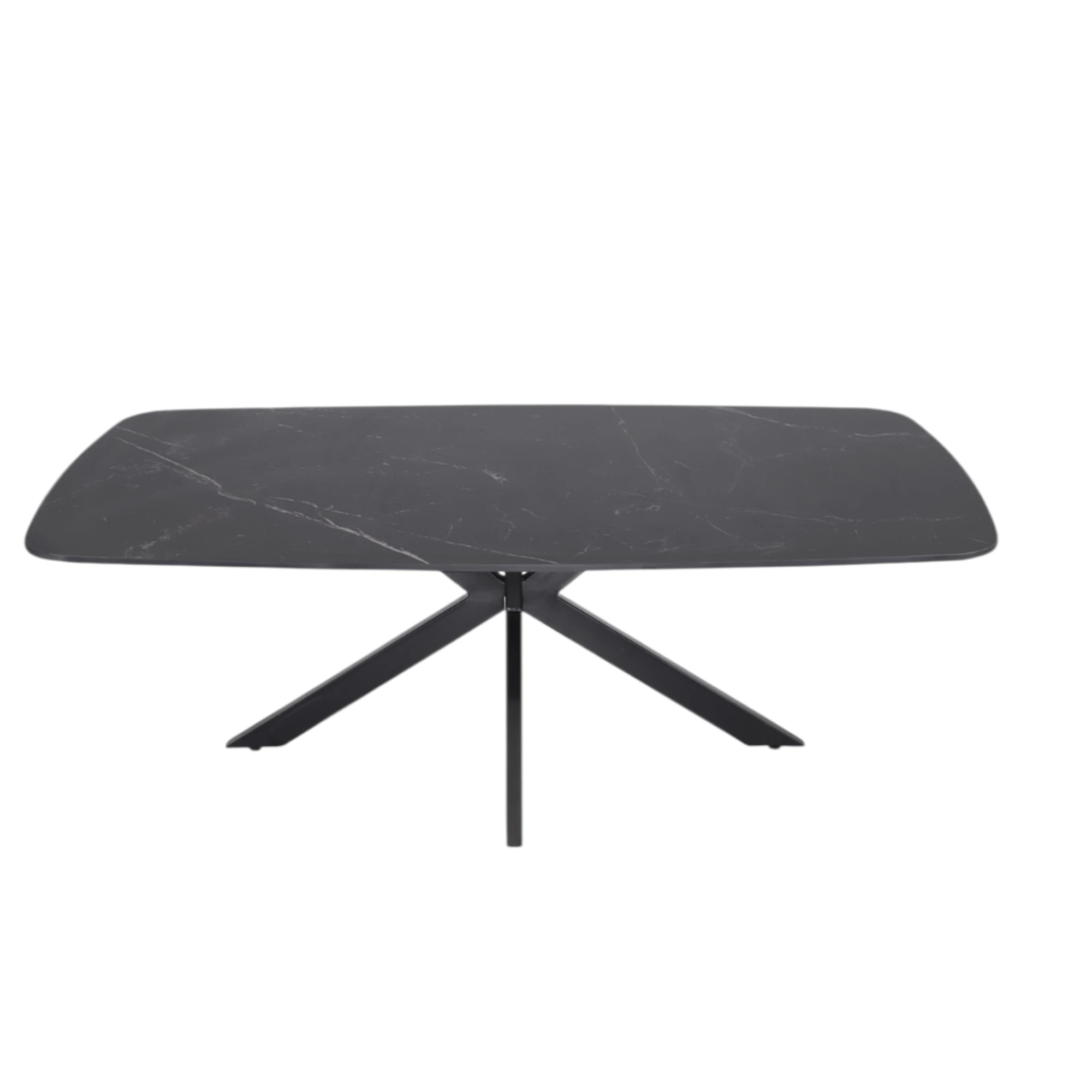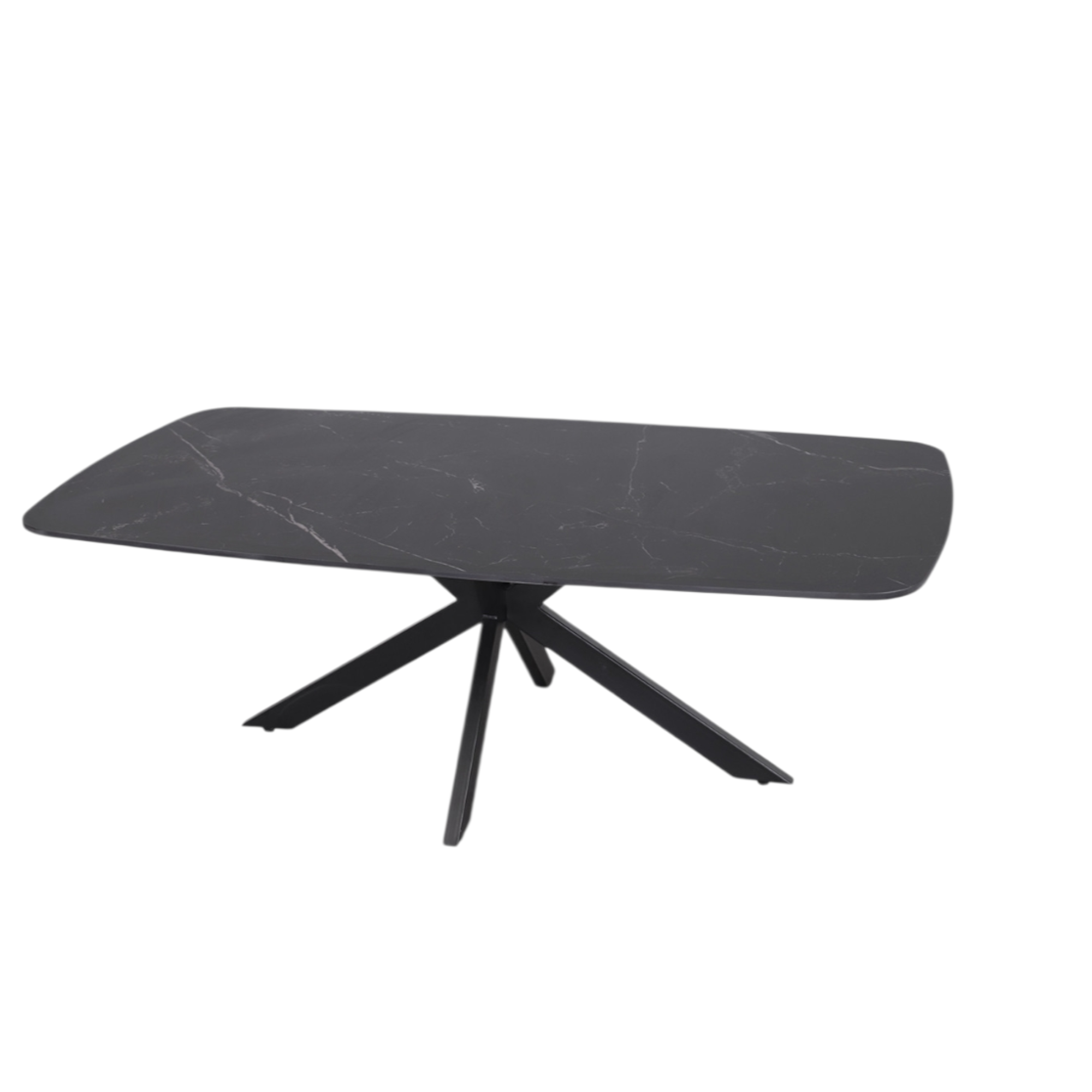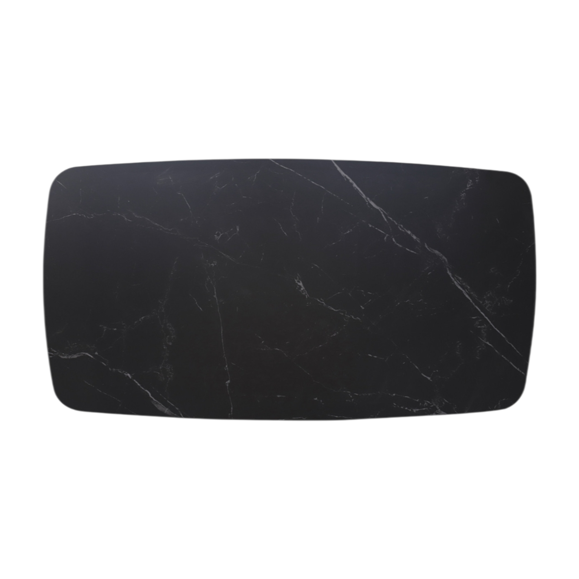 Cadre en métal, revêtu de poudre avec une laque structurée noire pour une surface mate et résistante à l’usure. Plateau de table en pierre frittée (Sintered Stone), composé de minéraux naturels et pressé puis cuit à haute température. Ce matériau est résistant aux rayures, à la chaleur et aux taches, facile d’entretien et durable, idéal pour une utilisation intensive.