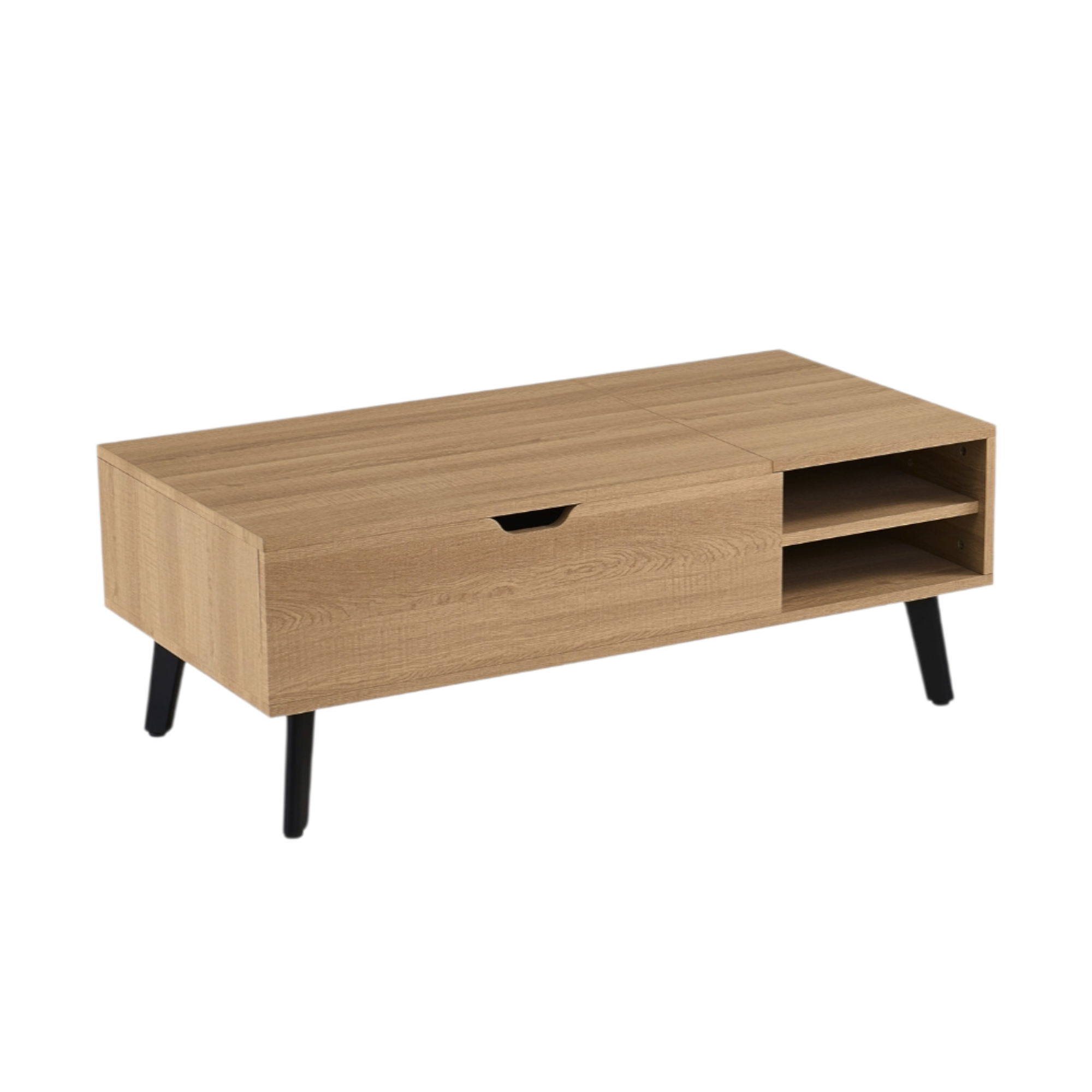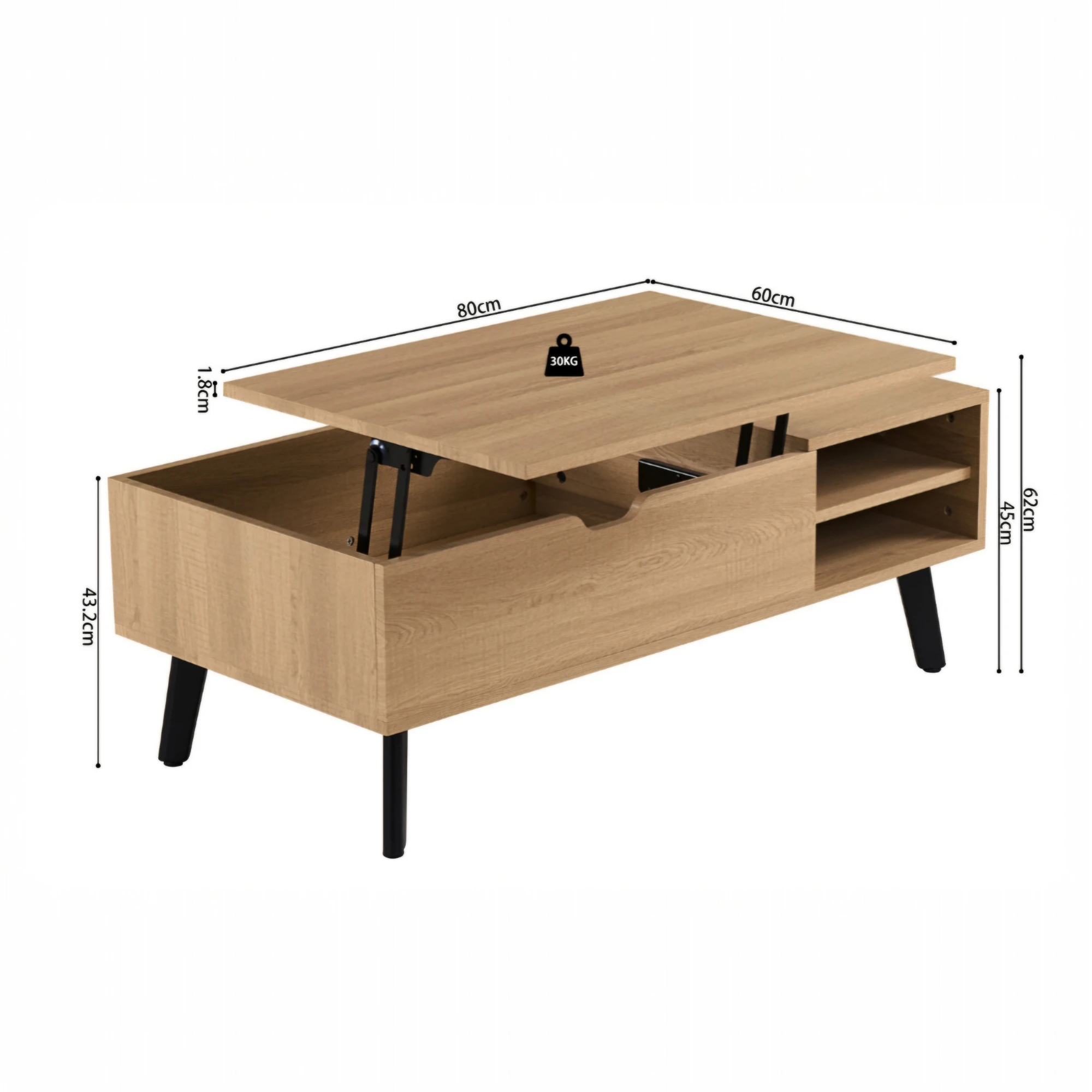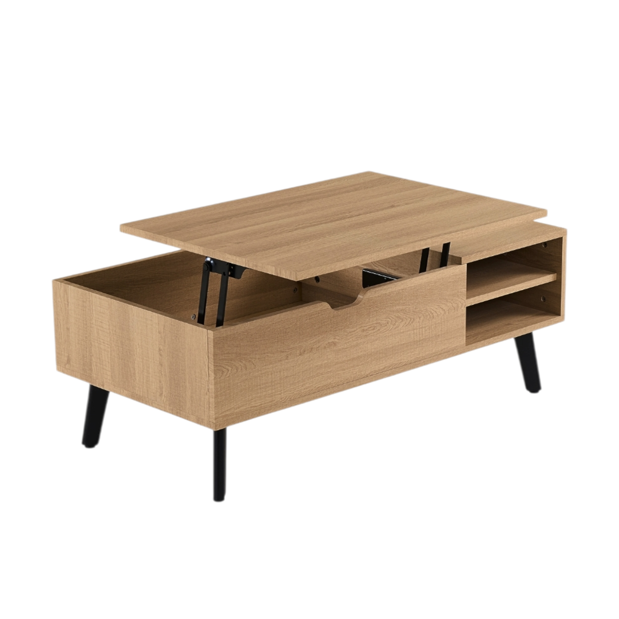Le plateau de la table est fabriqué en MDF de 18 mm d’épaisseur, revêtu d’un décor papier 3D reproduisant fidèlement la structure naturelle du bois. Cette finition offre une surface lisse, facile à entretenir et simple à nettoyer. Le plateau se compose d’une partie relevable de 80 cm et d’une partie fixe de 40 cm, offrant ainsi un espace de travail ou de repas supplémentaire lorsqu’il est déployé. Le mécanisme de charnière est solide et permet un mouvement fluide lors de l’ouverture et de la fermeture. Sous le plateau relevable se trouve un compartiment de rangement pratique, idéal pour y placer des livres, des télécommandes ou d’autres accessoires. Le piètement est constitué de pieds en acier revêtus d’une laque noire, assurant une structure stable et un design moderne. L’association de l’acier et du MDF rend la table durable, robuste et facile à entretenir.