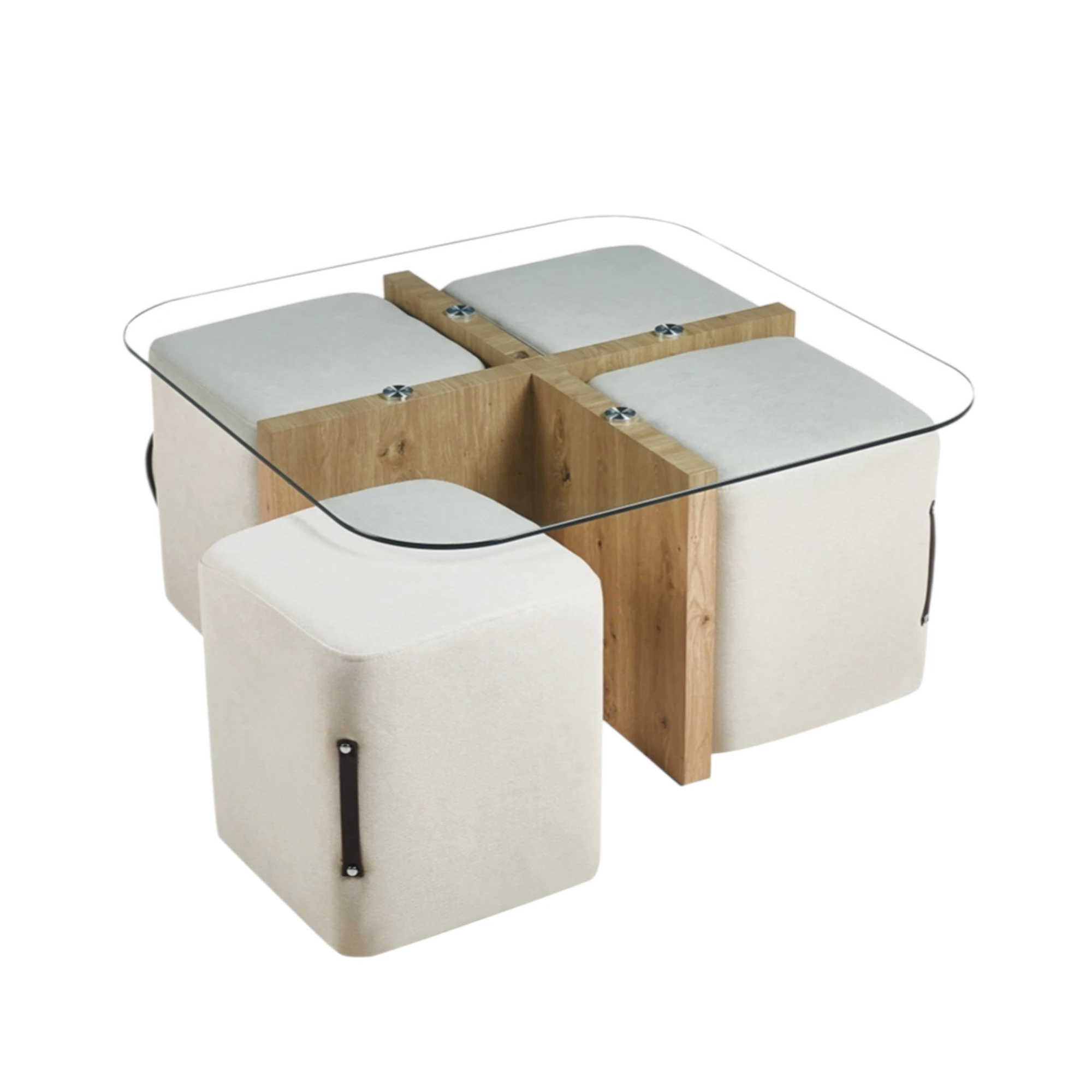 Le plateau de table est en verre de sécurité, particulièrement solide et sûr. En cas de bris, il se fragmente en petits morceaux non coupants. La structure est composée de MDF et recouverte d’un décor papier. Il s’agit d’un papier imprimé, imprégné de résine et collé sous haute pression sur du MDF ou du panneau de particules, créant ainsi une surface décorative. Les poufs sont constitués à 100 % de polyester. Ce tissu est solide et résistant à l’abrasion, ce qui le rend parfaitement adapté à une utilisation quotidienne. Les autres avantages sont la stabilité des couleurs et des formes, la facilité d’entretien et un prix abordable.