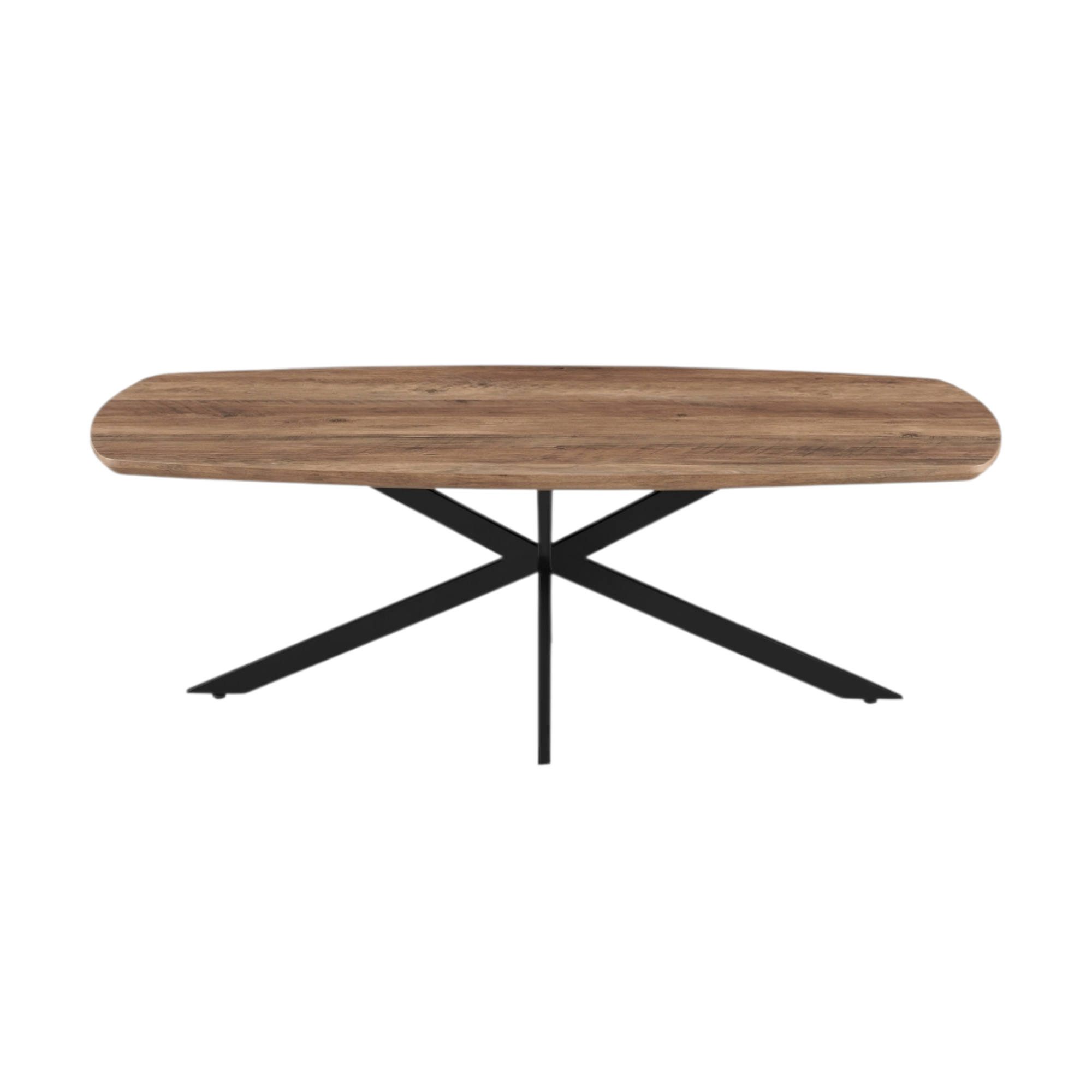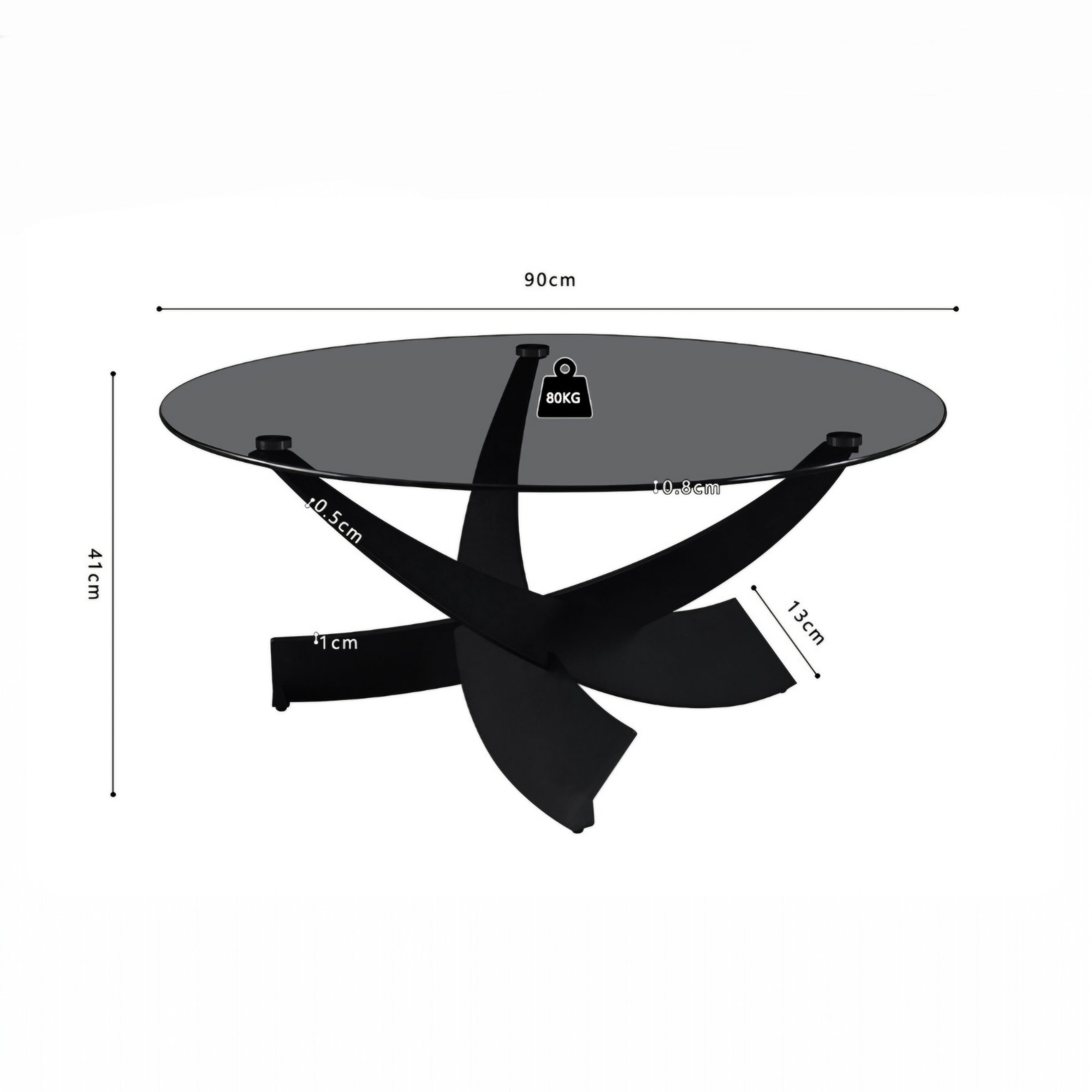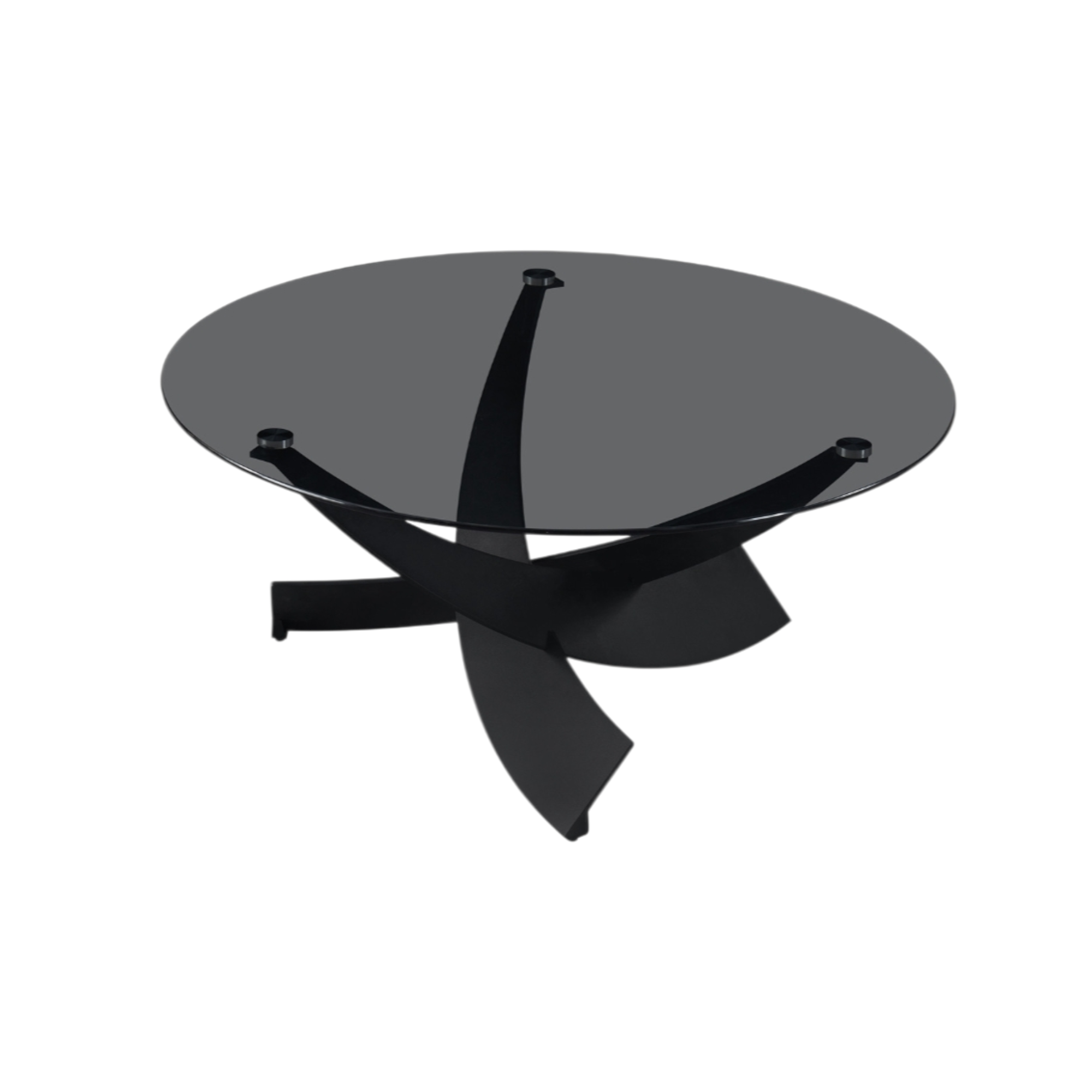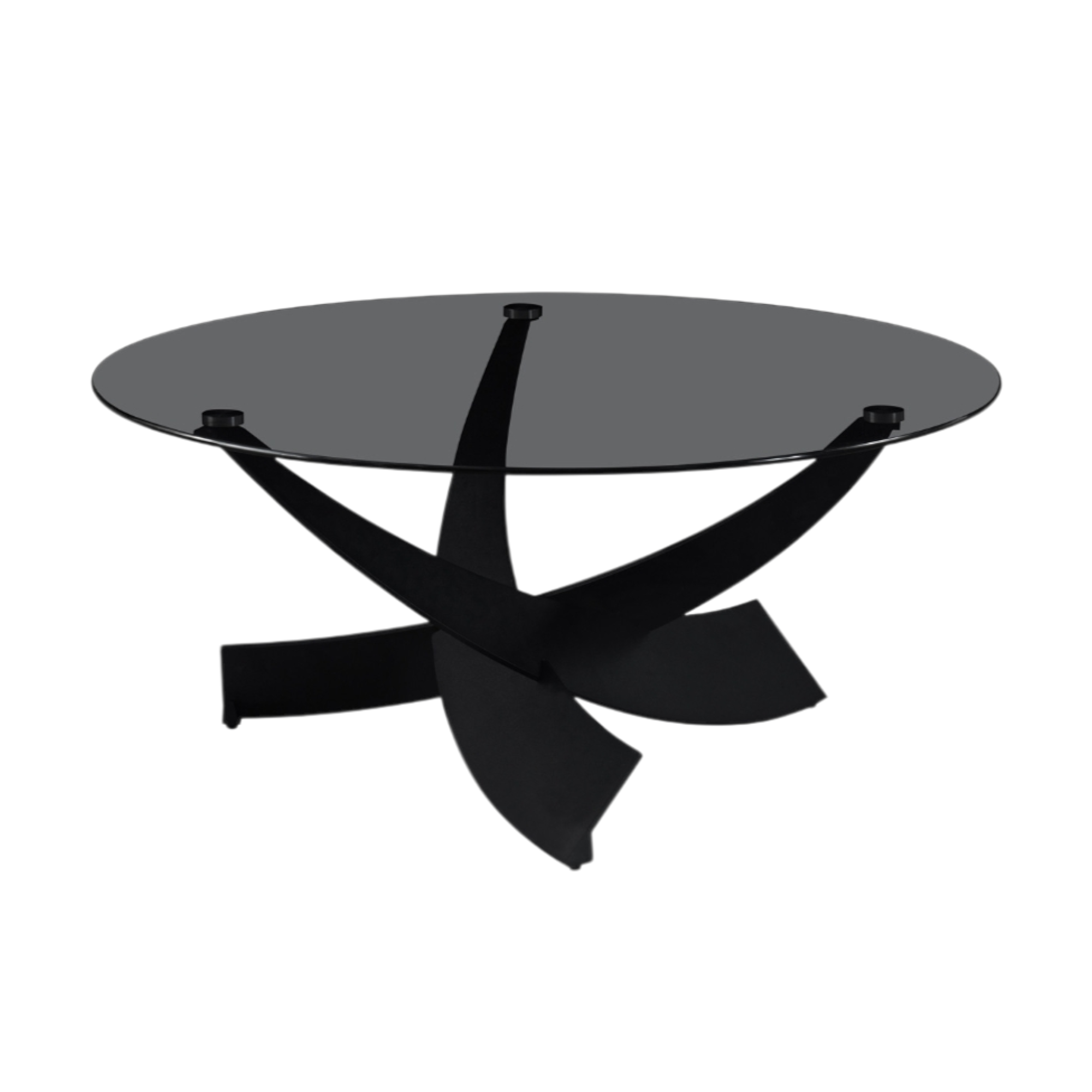 Le plateau de table est fabriqué en verre trempé de 8 mm d’épaisseur, avec une teinte gris fumé. Ce verre est durable, résistant à la chaleur et aux chocs, et facile à entretenir. Le piètement se compose d’un cadre métallique au design caractéristique en croix. Les pieds sont revêtus d’une peinture en poudre noire, garantissant une surface résistante à l’usure, à la rouille et facile d’entretien. La construction est stable et solide, le plateau en verre étant soutenu par des supports en caoutchouc qui empêchent le contact direct entre le verre et le métal et offrent une protection supplémentaire.